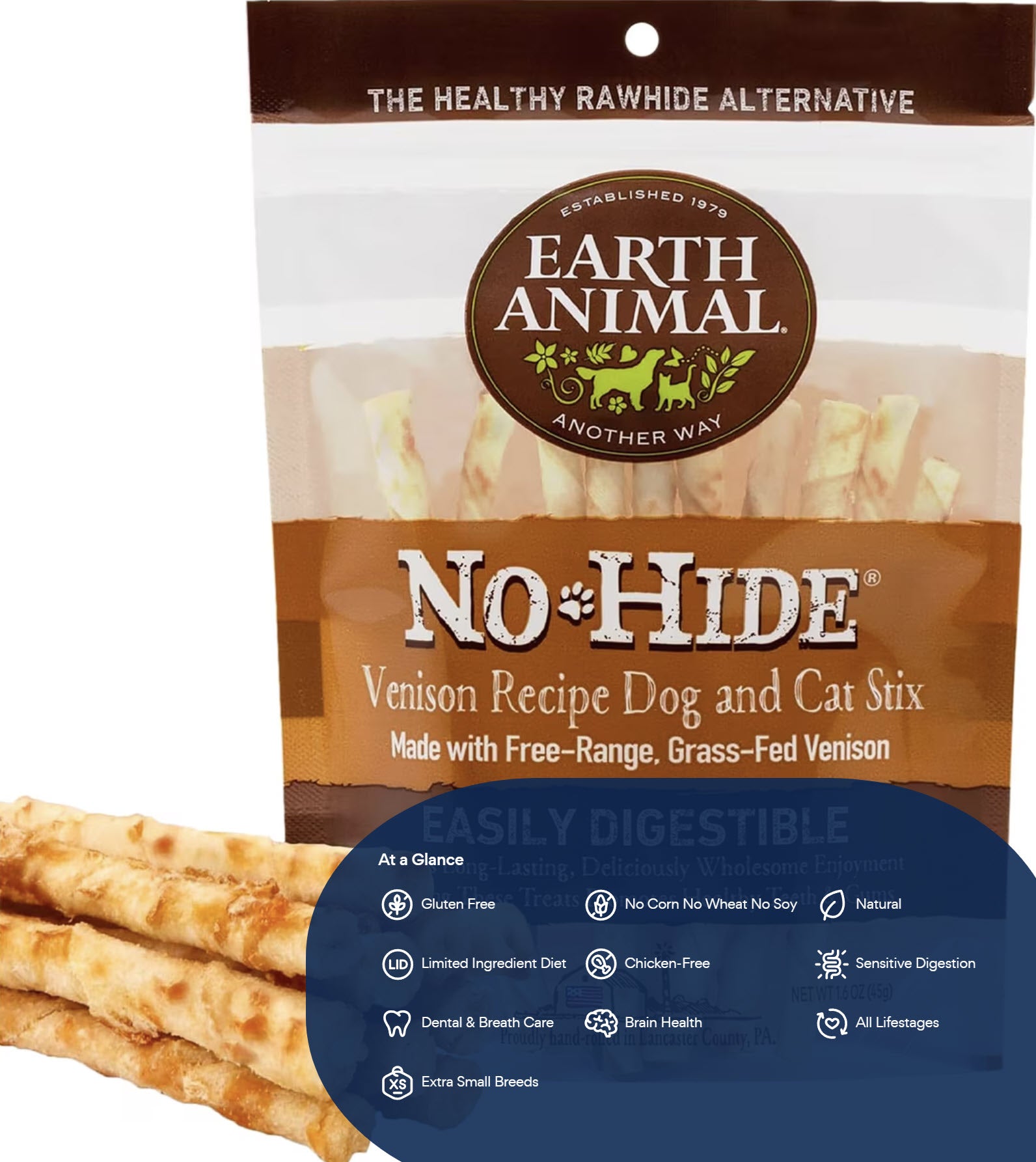 Our venison No-Hide® Wholesome Chews are the healthy, hand-rolled alternative to rawhide!   Each small chew delivers a delicious, long-lasting chewable bliss to dogs of all shapes.  We call it No-Hide® Nirvana!