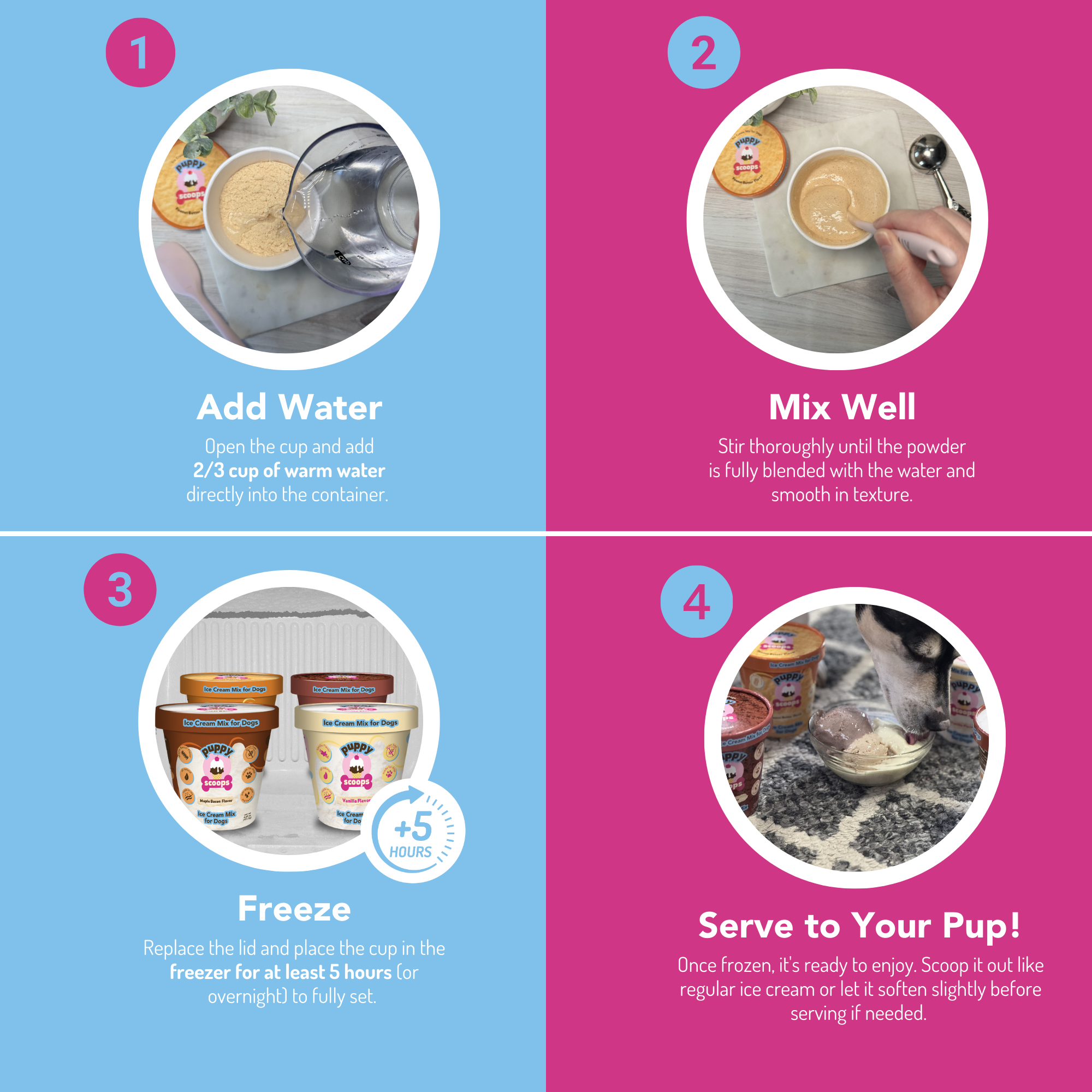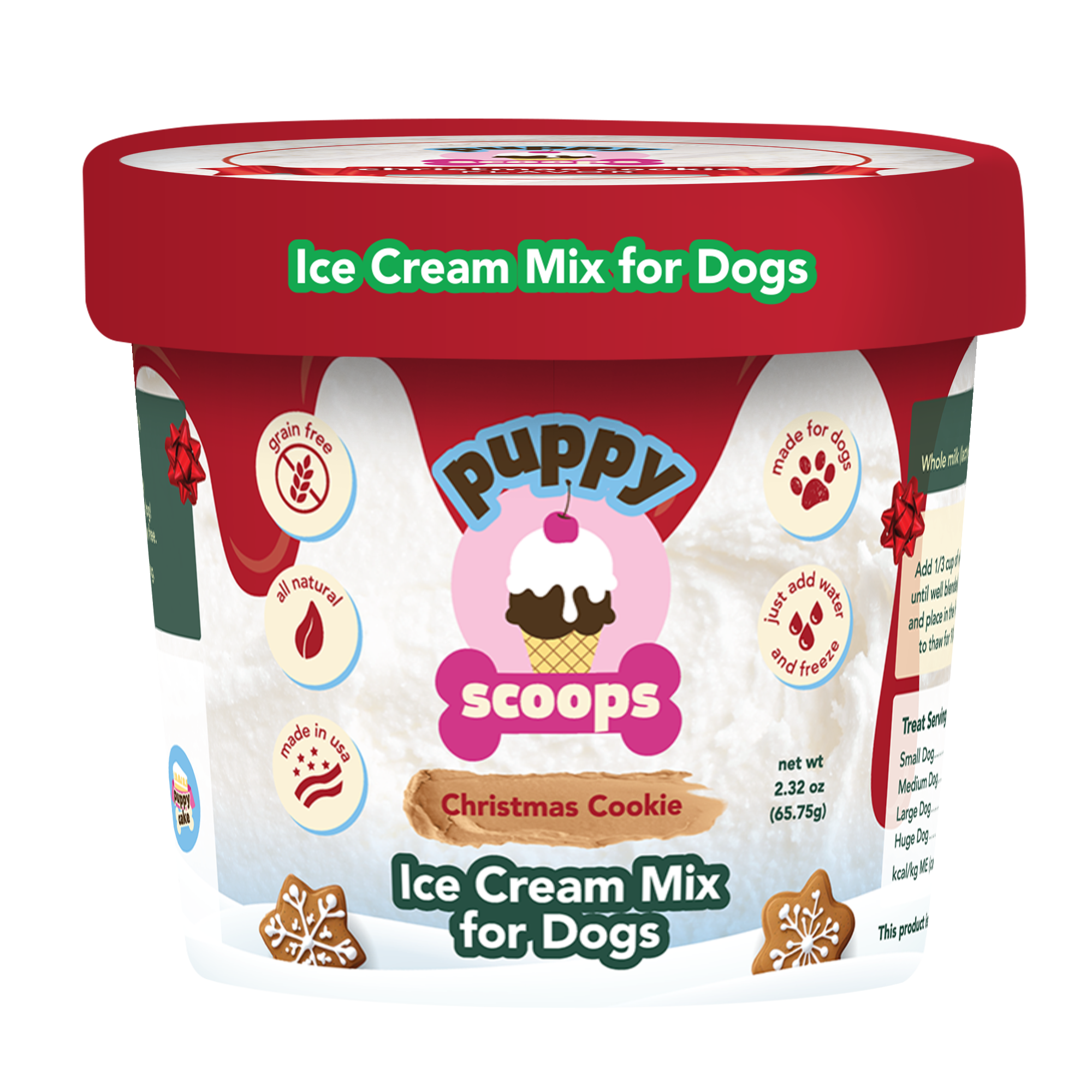 Enjoy the perfect Christmas gift for your pup or the dog lover on your least. Just add water and freeze to Puppy Scoops all natural and made in USA ice cream mix for dogs. Made with lactose free whole milk, a small amount of cane sugar, gelatin, salt and different flavoring like carob, peanuts, vanilla flavor and roast beef flavor.